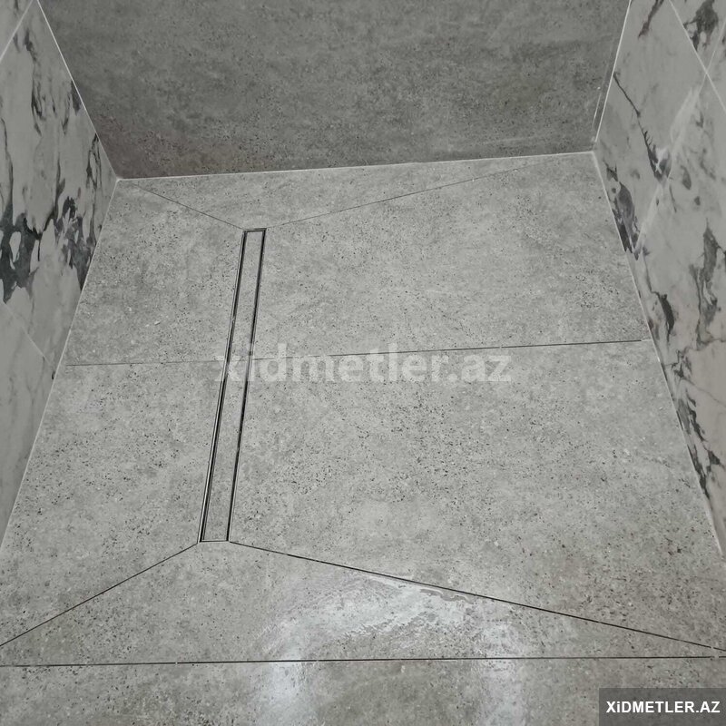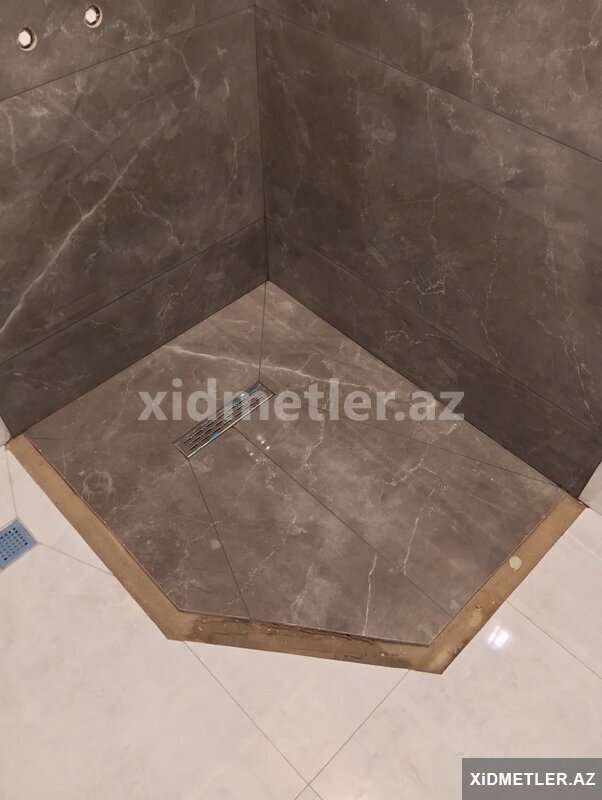 - Duş zonası üçün maili döşəmə: xətti drenaj üçün ölçüyə uyğun kəsim, izolyasiya və sızdırmazlıq