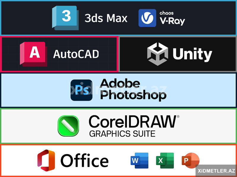 Şirkət150 Azn Qrafik - dizayn və montaj proqramları kursları hamsı bir ünvanda Autocad, Archicad , 3ds max , Vray , Corel draw, Adobe photoshop, proqramlarının tədrisi Adobe İllustrator, İndesign , After Effect kursu, Adobe Premiere