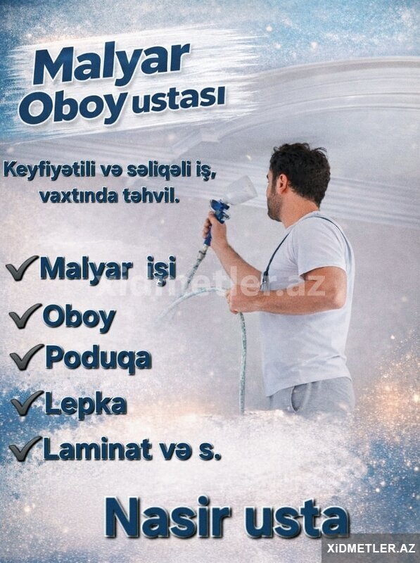 5 AznMalyar – Oboy – Şpaklyovka Ustası Peşəkar malyar, oboy və şpaklyovka ustası kimi uzun illərin təcrübəsi ilə ev və ofislərinizi yüksək keyfiyyətlə təmir edirəm. İşlərim səliqəli, vaxtında və zəmanətlə icra olunur