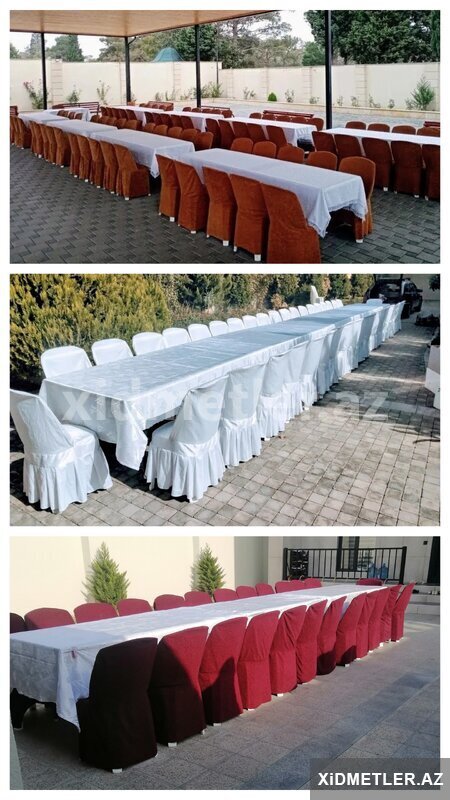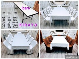 60 Azn Ad günləri, nişan, xına, toy axşamı, tədbirlər və ya digər xüsusi günlər üçün günlük icarəyə verilir. Ağ plastik və parça örtüklü stul variantları. - Örtüksüz ağ plastik 1 azn - Ağ atlas ətəkli örtüklə 1.3 azn - Qırmızı