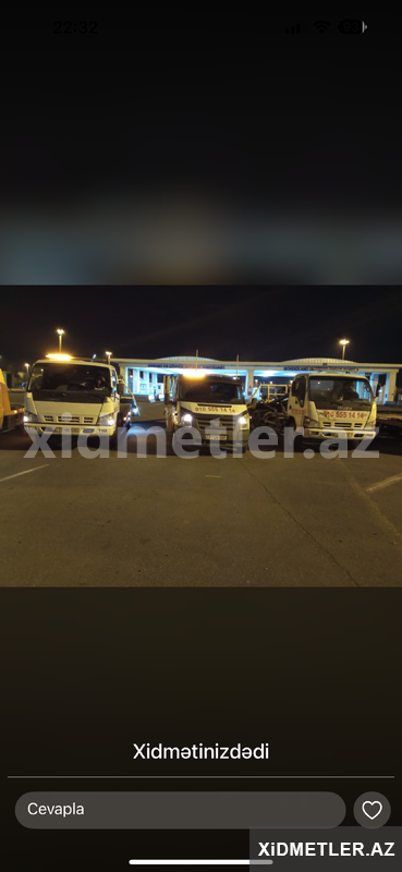 15 Azn Ən ucuz Evakuator xidməti Azərbaycan respublikasının bütün ərazisində xidmətinizdəyik bütün növ nəqliyyat və aqir tonnajlı yüklerin daşınması.7/24.Əlavə məlumat üçün zəng vura bilərsiz